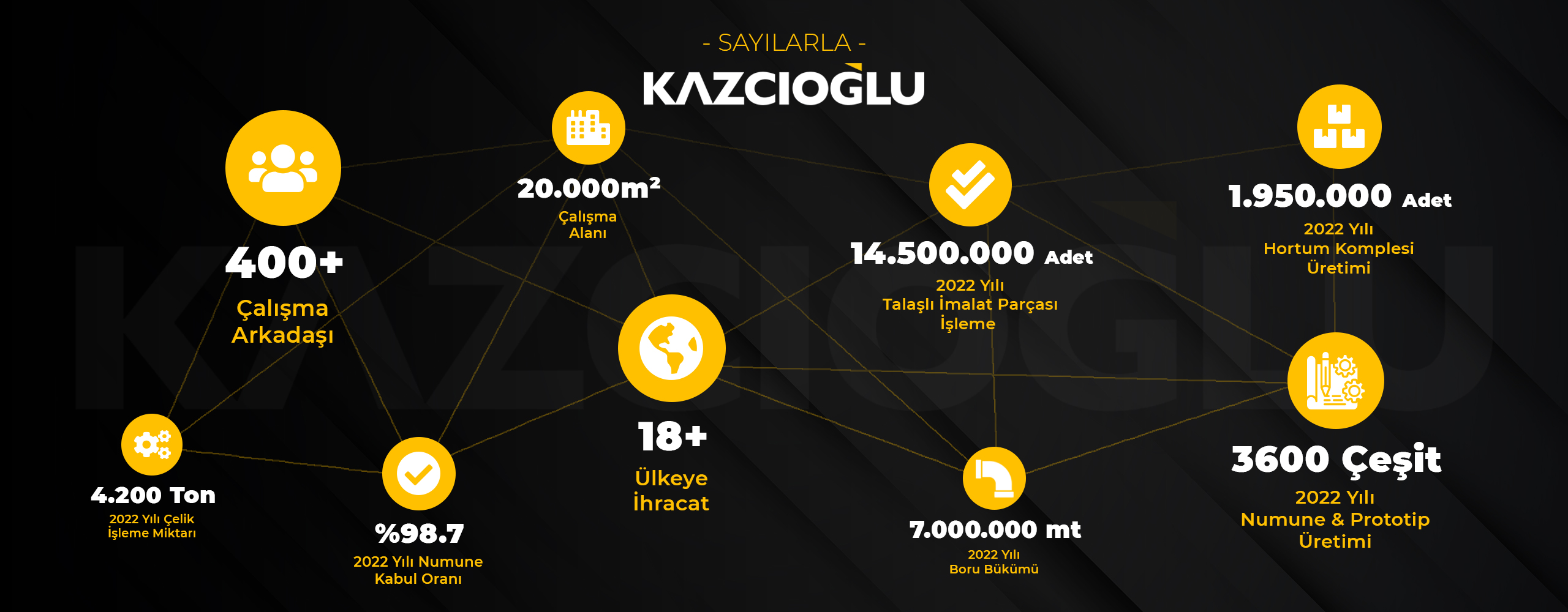 1960 yılından bu yana KAZCIOĞLU markası ile otomotiv, traktör, iş makinesi, demiryolu ve savunma sanayilerine boru ve hortum kompleleri ile talaşlı işleme parçalarının imalatını, son teknolojiyi kullanarak gerçekleştirmekteyiz. 2500’den fazla OEM referans üreten firmamız IATF 16949:2016 ve TS EN ISO 9001:2015 sertifikalarına sahiptir.